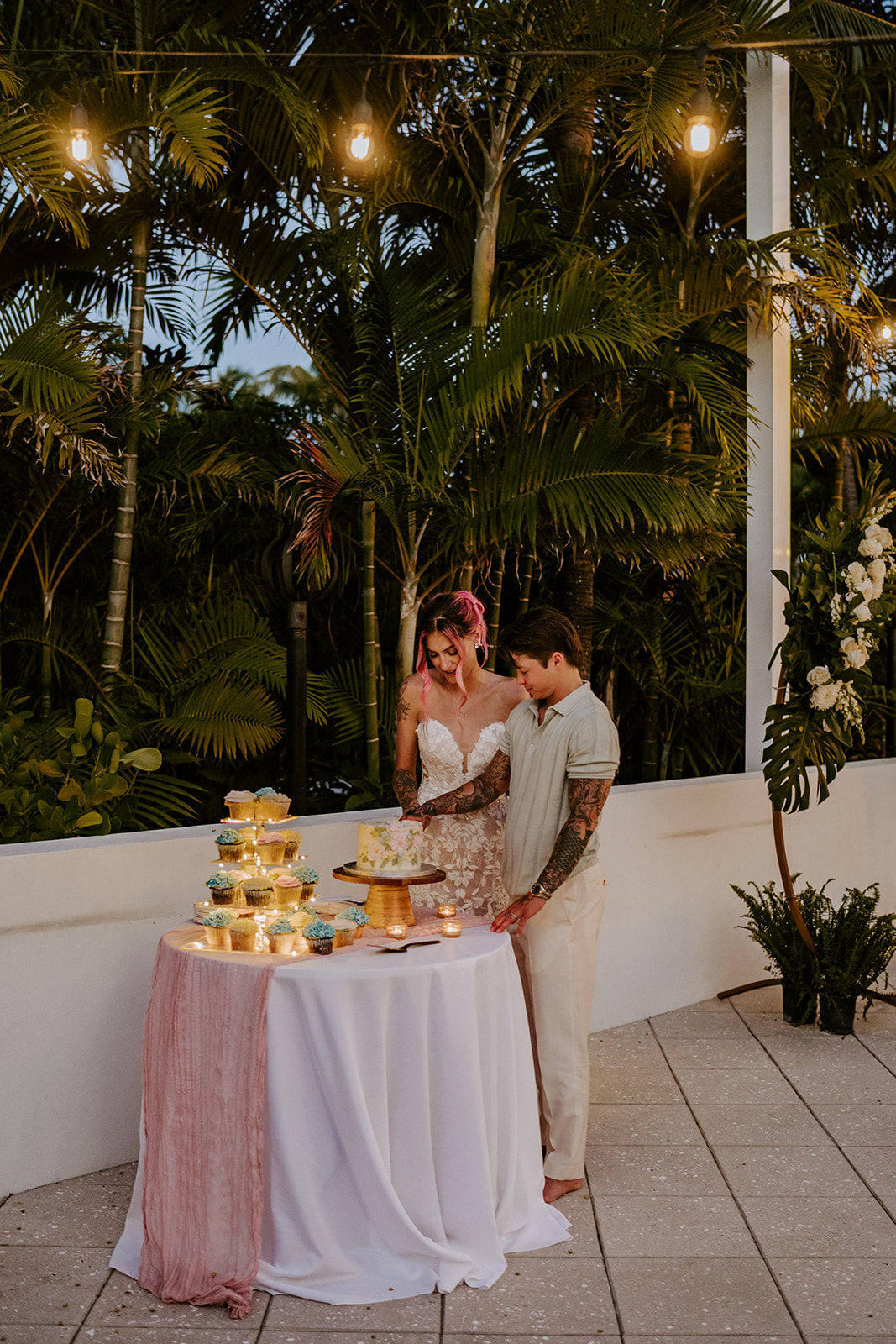 Dessert featured chocolate tarts, cupcakes, and a small wedding cake adorned with delicate icing florals. As night fell, guests danced beneath the string light with the ocean breeze. It was joyful, intimate, and perfectly them.