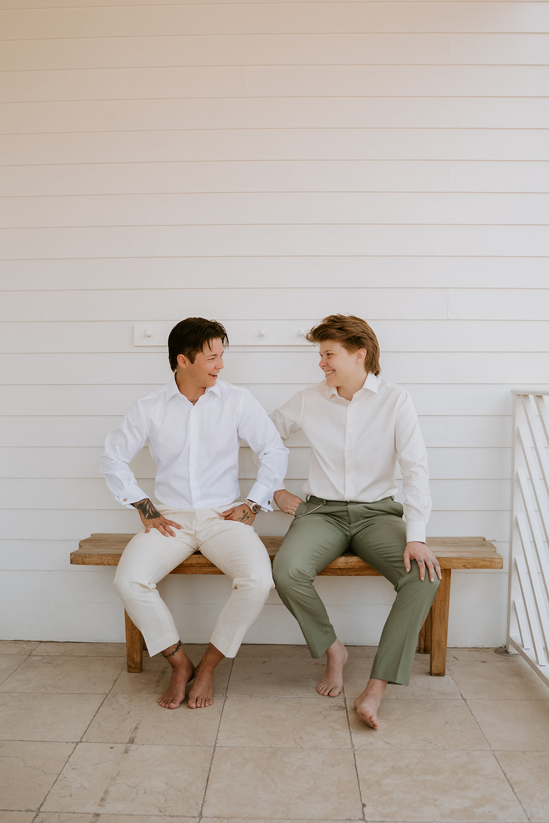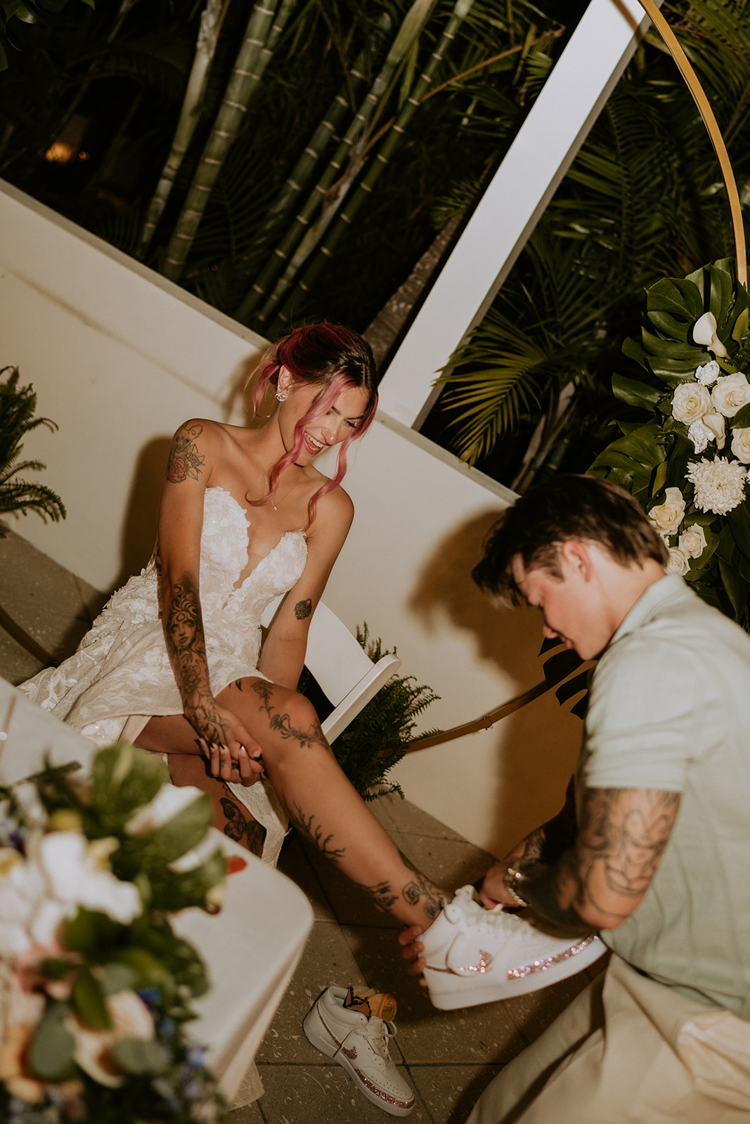 They each got ready separately with their closest people before making their way to the beach. In a detail I absolutely loved, both Alyson and Liam showed off their fun sneakers for the reception — a playful, personal touch — after going barefoot for the ceremony itself.