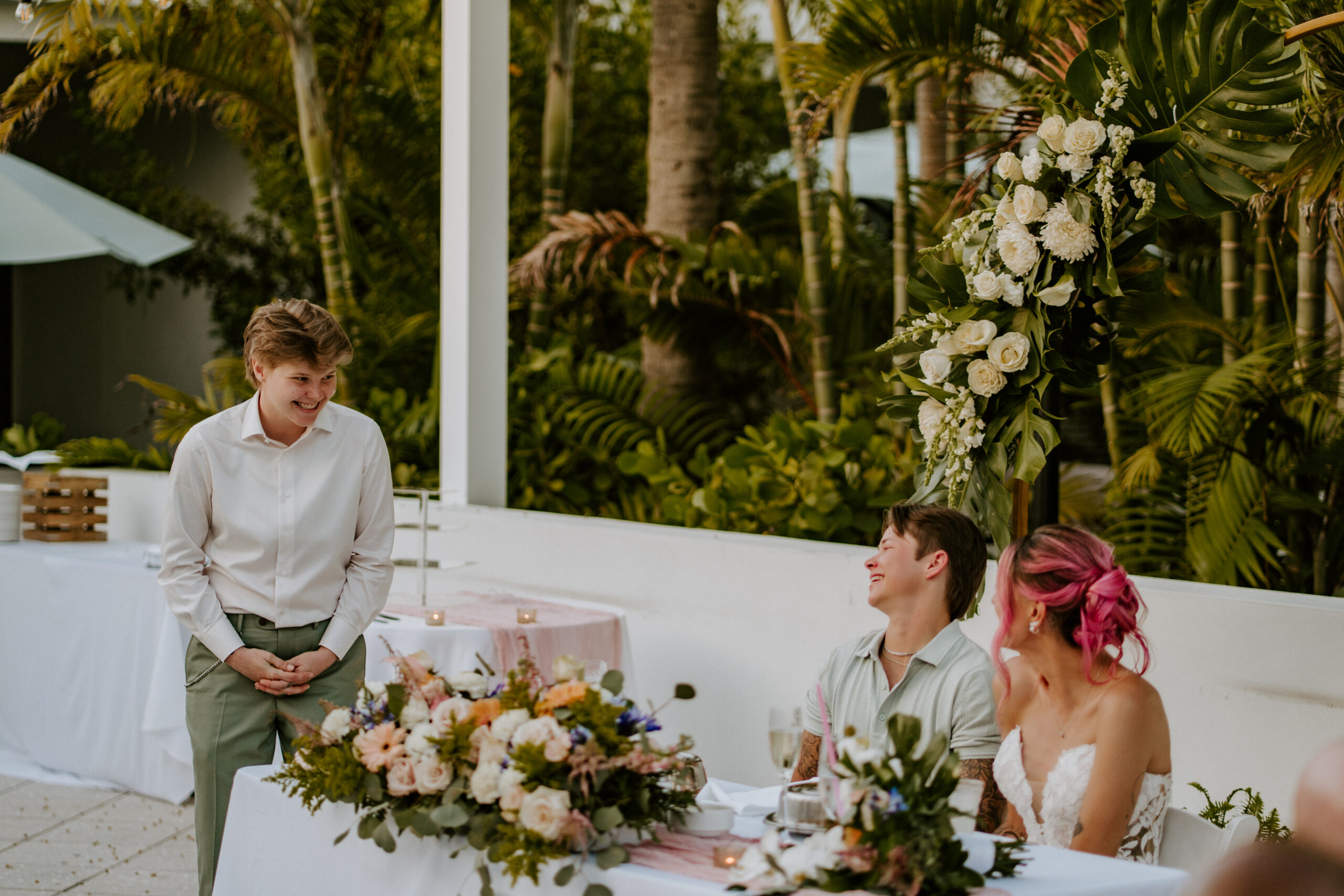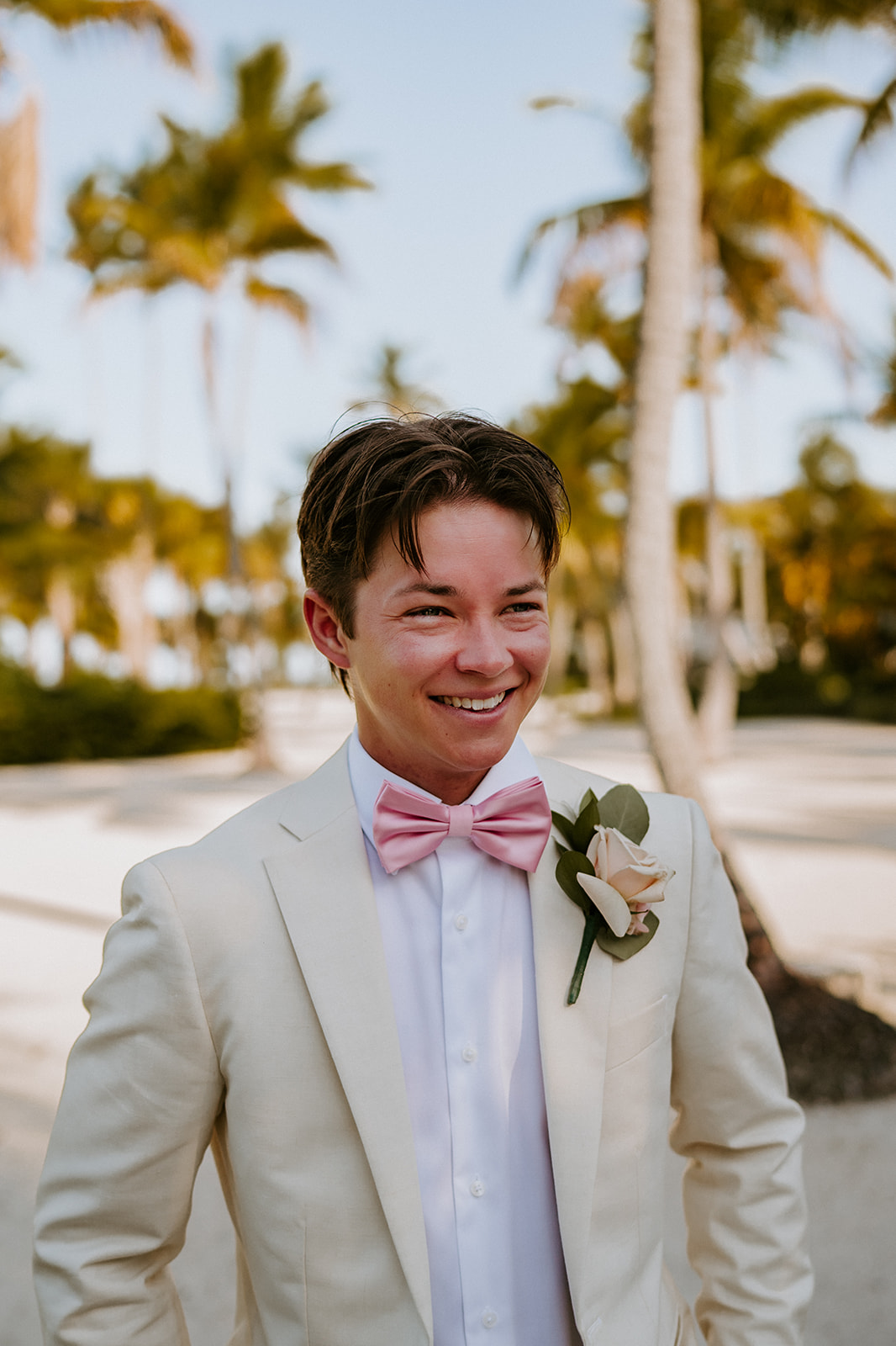 Alyson’s bridesmaid wore a stunning green satin gown, while Liam’s groomsman wore a light green suit that perfectly complemented the tropical setting. The color palette felt organic and effortless against the blues of the ocean and the neutral sand.