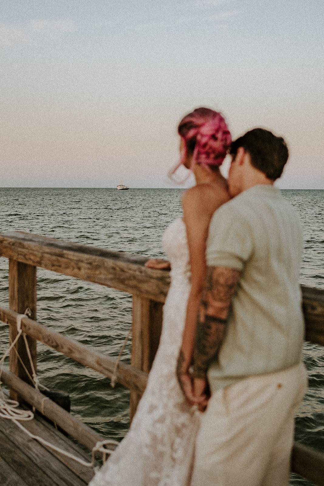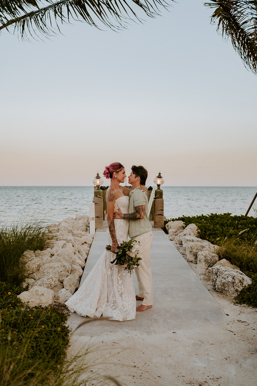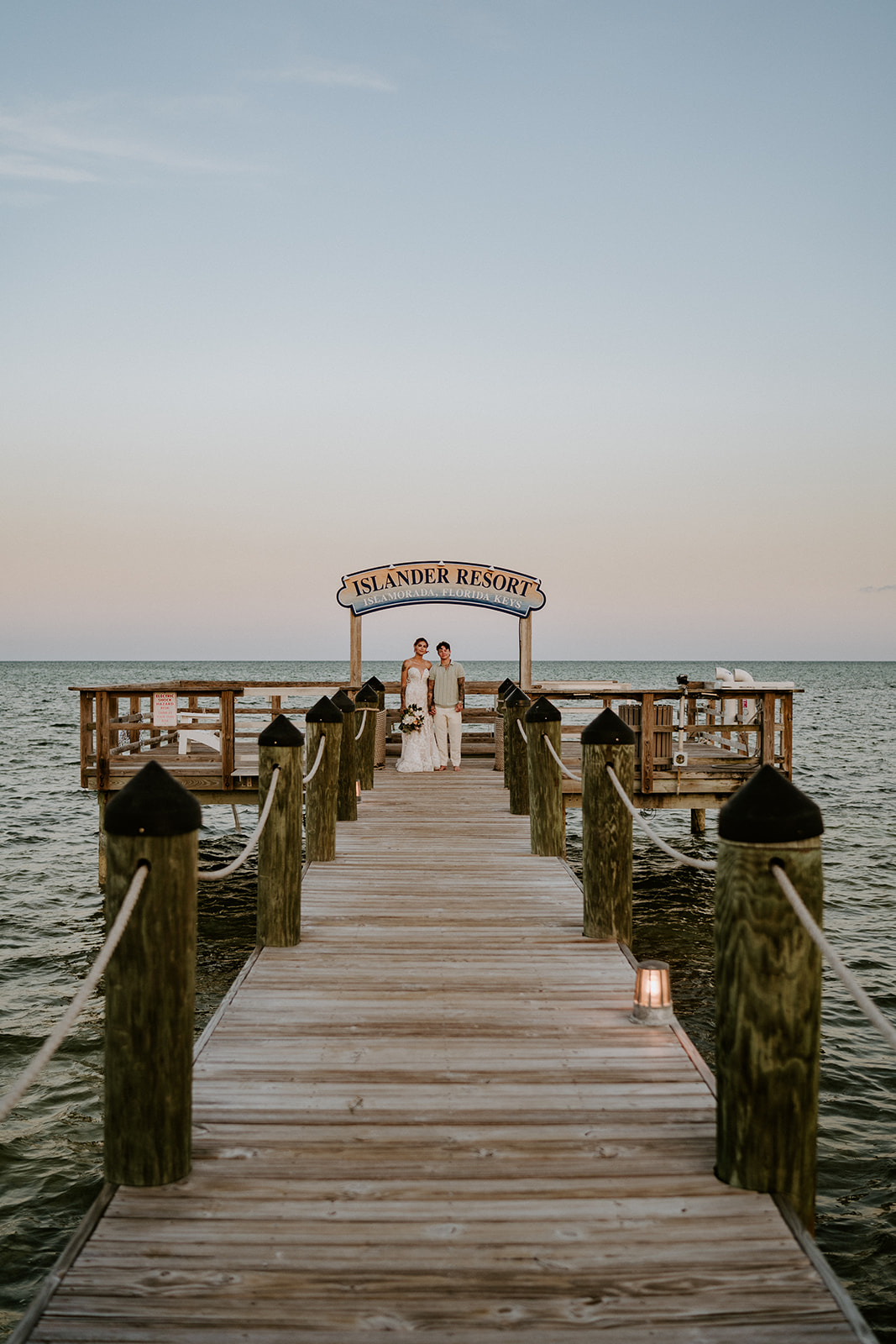 For the reception, Liam changed into a green collared shirt. It was relaxed, polished, and perfect for celebrating. As the sun began to dip, we stepped away for sunset portraits on the dock. The sky turned soft shades of gold and pink. It was the kind of Florida Keys sunset you can’t plan but always hope for.