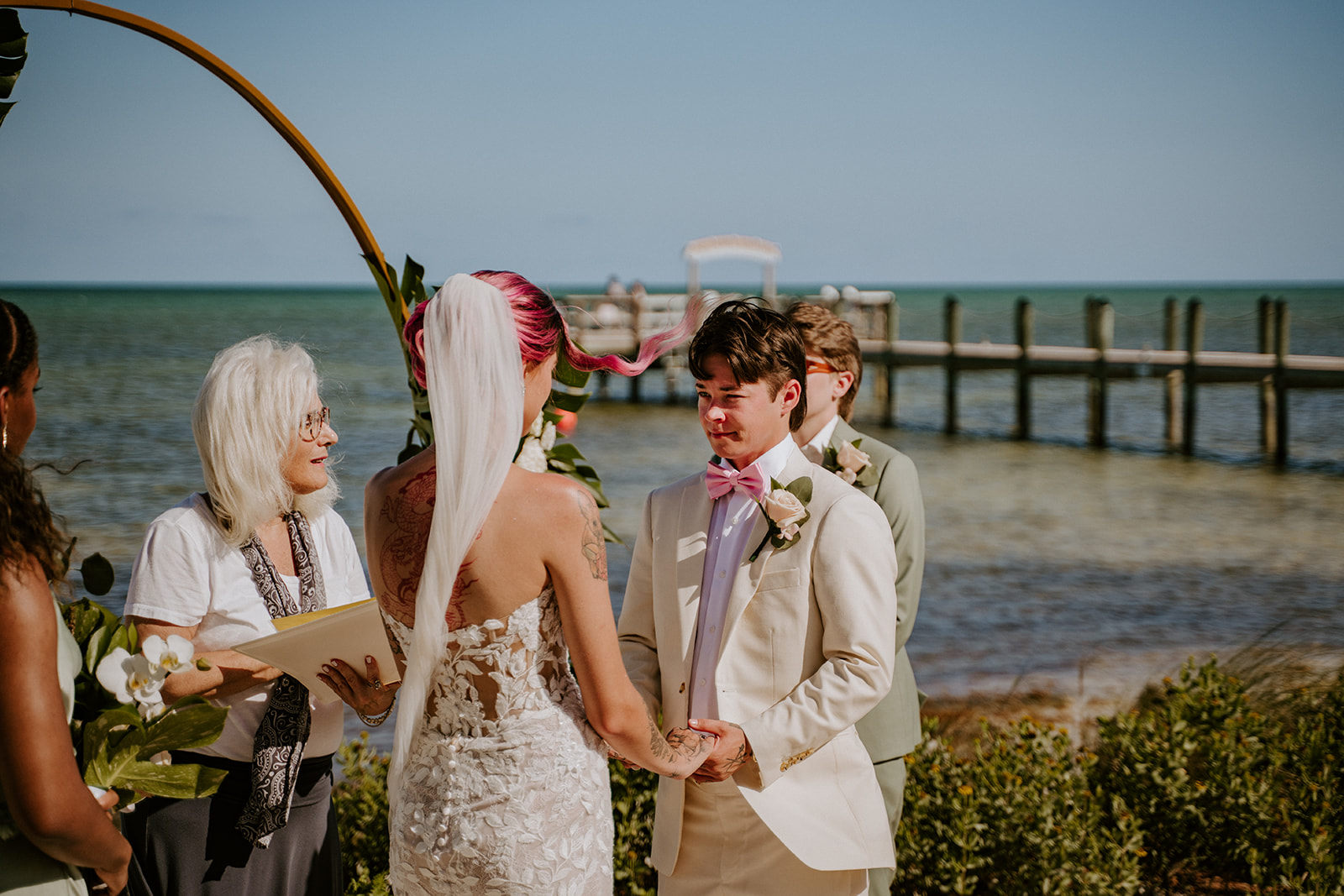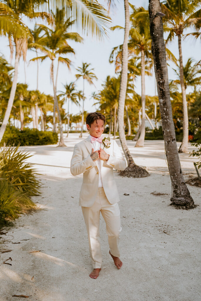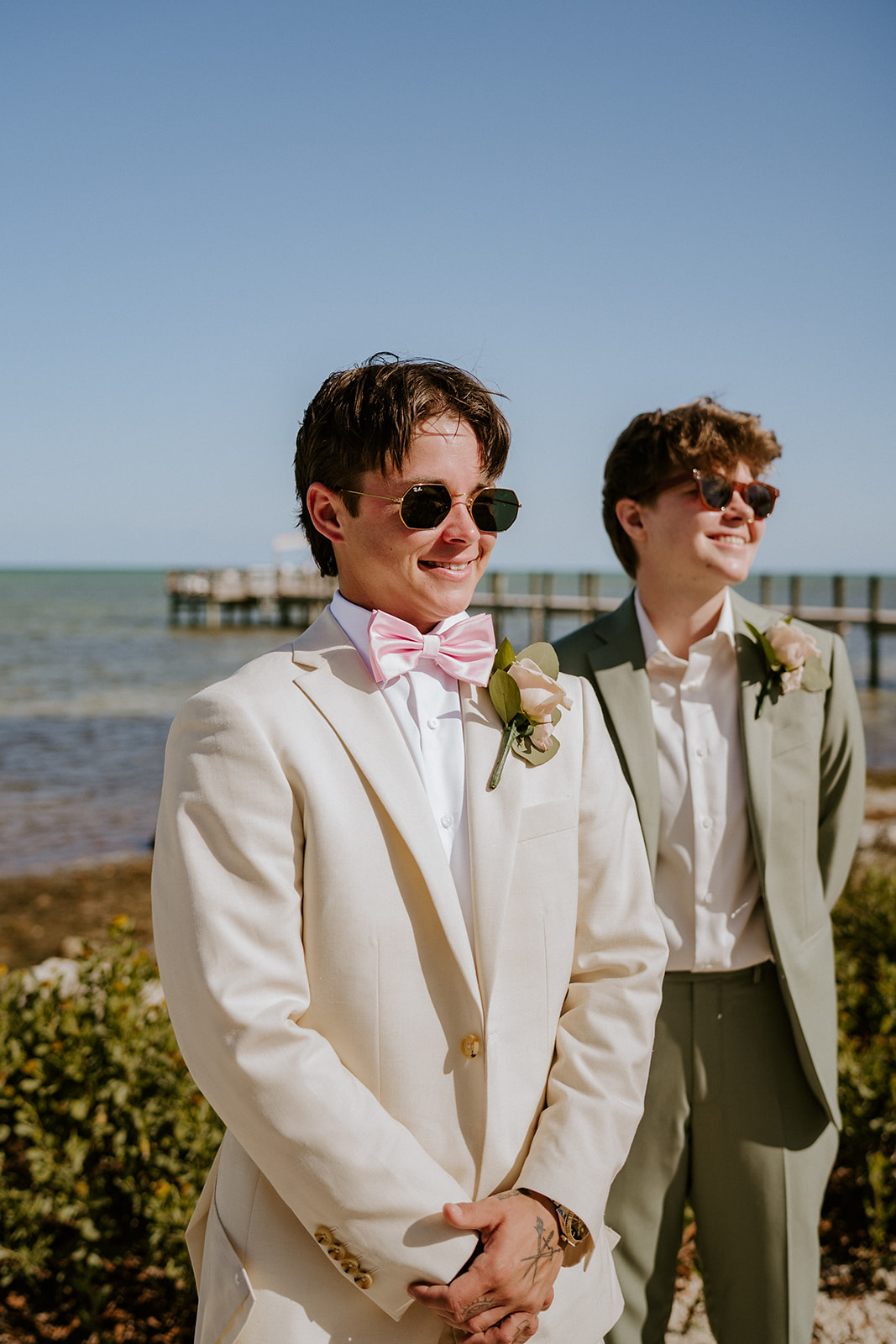 For the reception, Liam changed into a green collared shirt. It was relaxed, polished, and perfect for celebrating. As the sun began to dip, we stepped away for sunset portraits on the dock. The sky turned soft shades of gold and pink. It was the kind of Florida Keys sunset you can’t plan but always hope for.