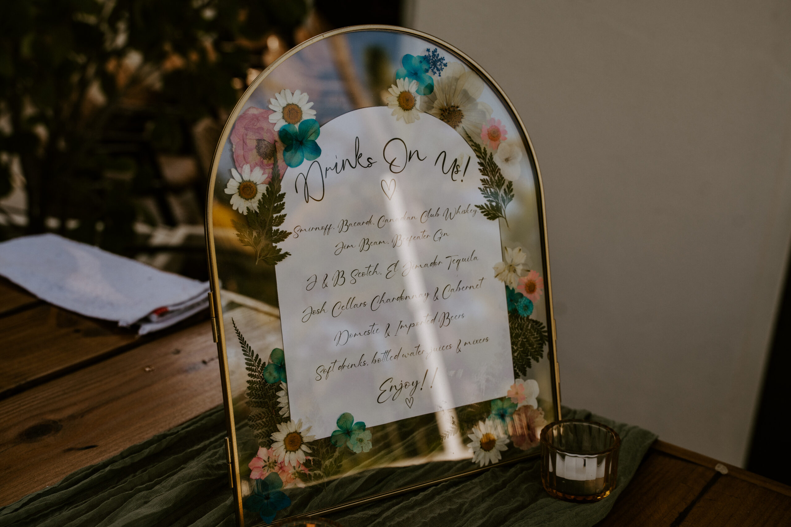 Alyson and Liam are the kind of couple you instantly feel comfortable around. They love motorcycle rides, spending time with their fur babies (who were sweetly featured on their cocktail napkins), and building a life that feels authentic to them. Alyson, a talented tattoo artist, brings an artistic edge to everything she touches. Together they have this creative, grounded energy.