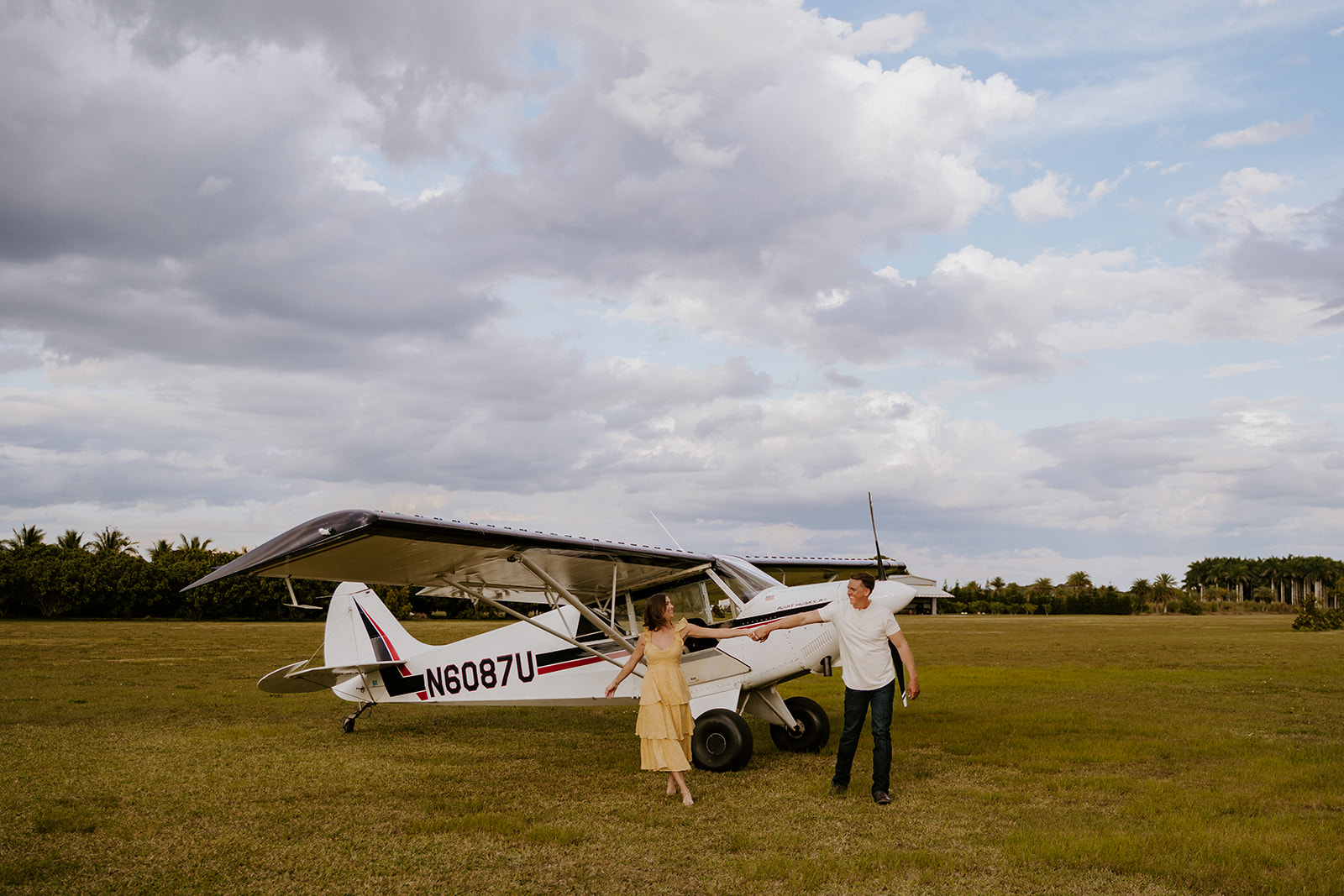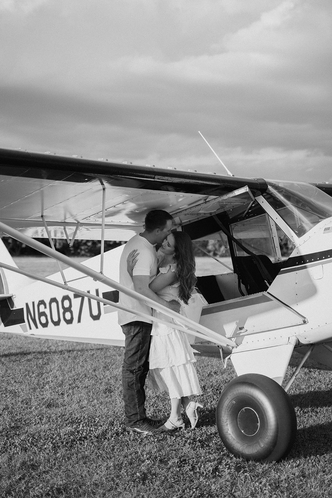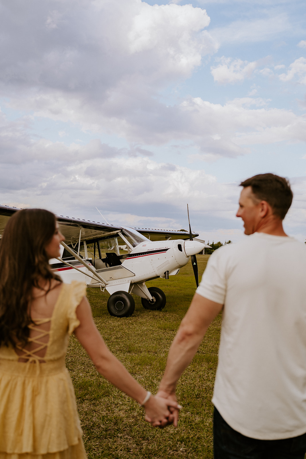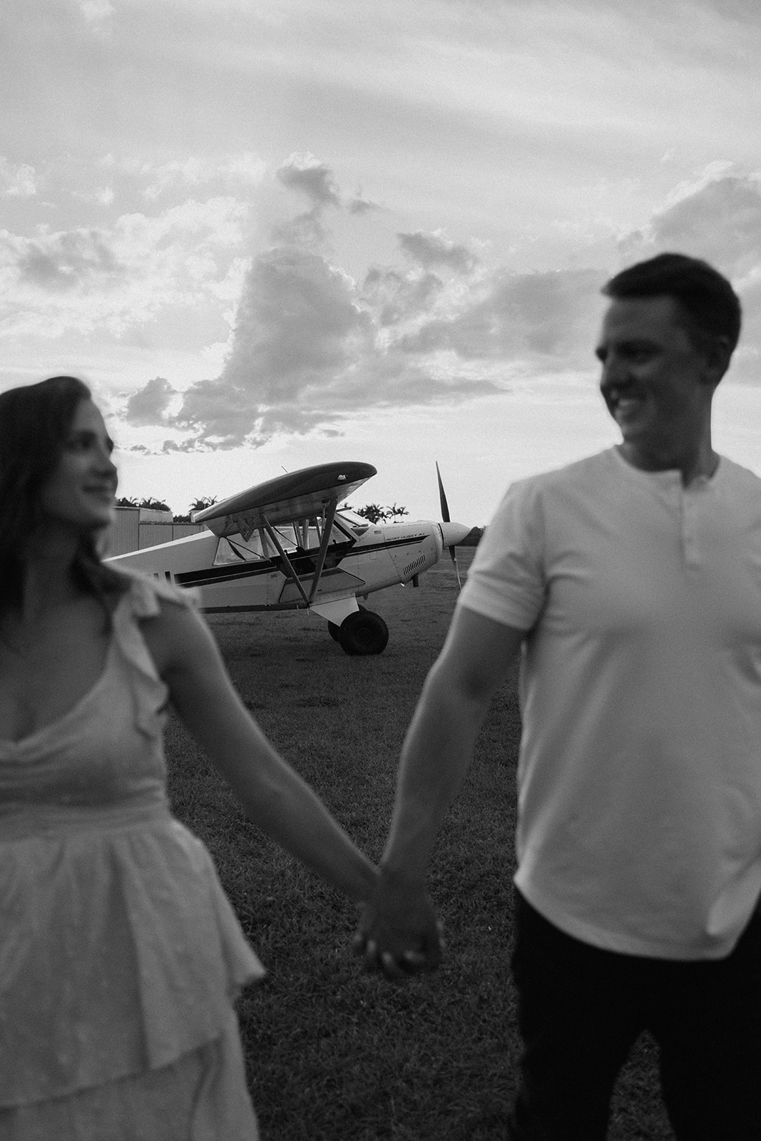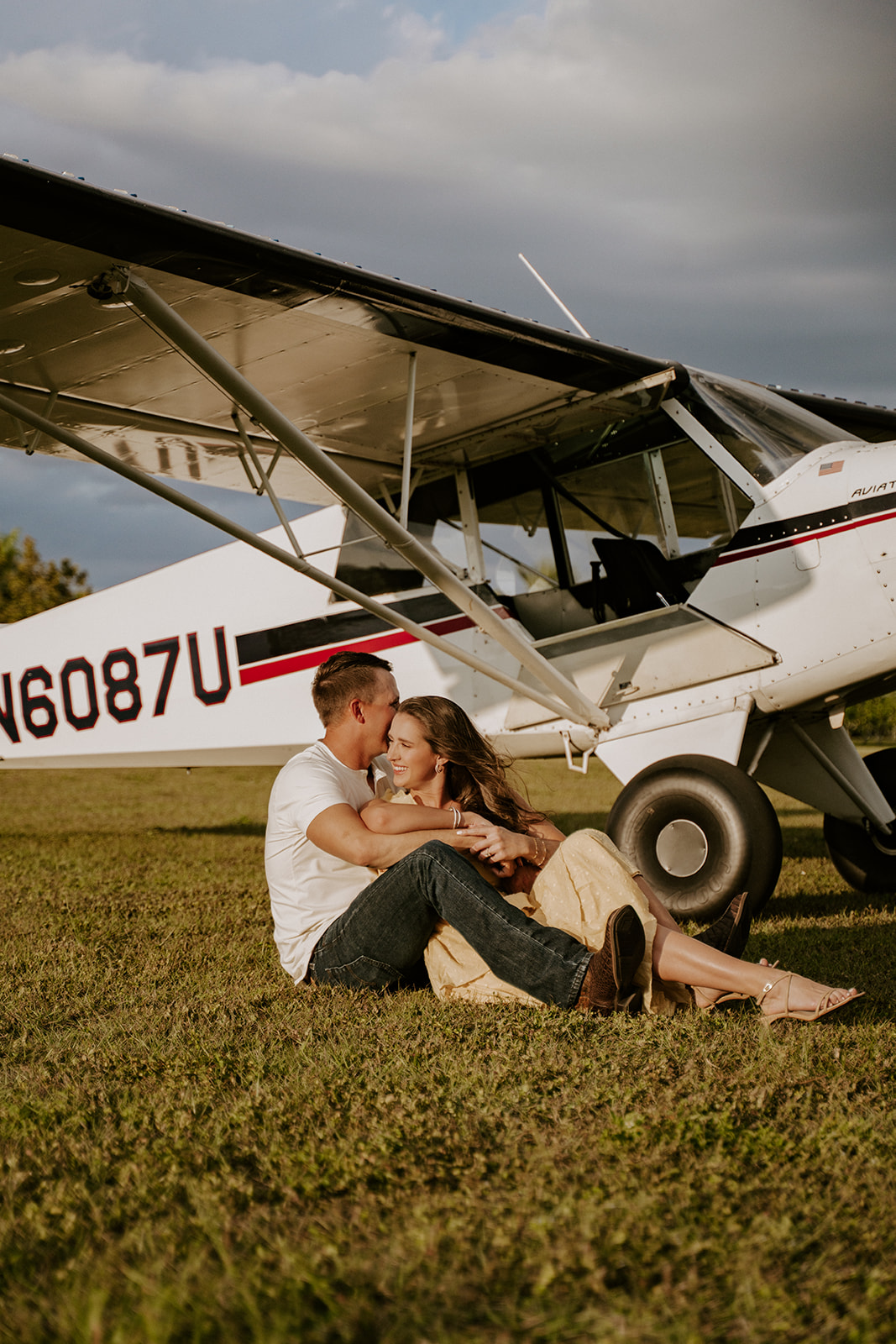 Chase is a pilot, so when Macie and Chase started planning their engagement photos, it felt natural to include the airplane he flies. Instead of choosing a typical engagement session location, we met in a quiet field in Homestead where the plane is stored.